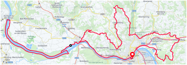 55 Kilometer in 7,5 Stunden waren geschafft! Jetzt begann der harte und mental sehr fordernde Teil. Entlang der Donau bei Hagel und Sonnenschein bis nach Aschach und 26 Kilometer von dort zurück nach Linz. Bei Kilometer 80 holte ich zwei Geher ein, die schon seit 22 Stunden unterwegs waren und wohl noch 5 Stunden vor sich hatten!