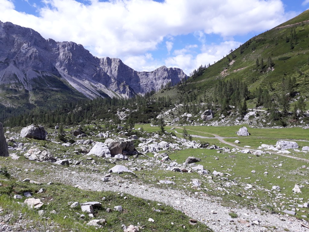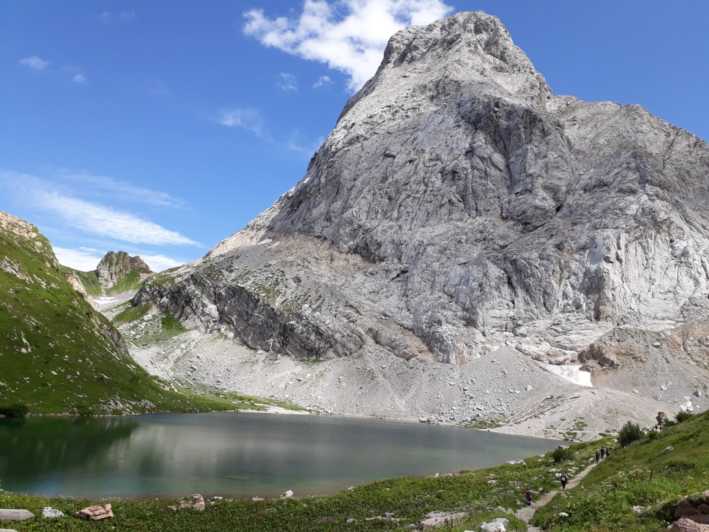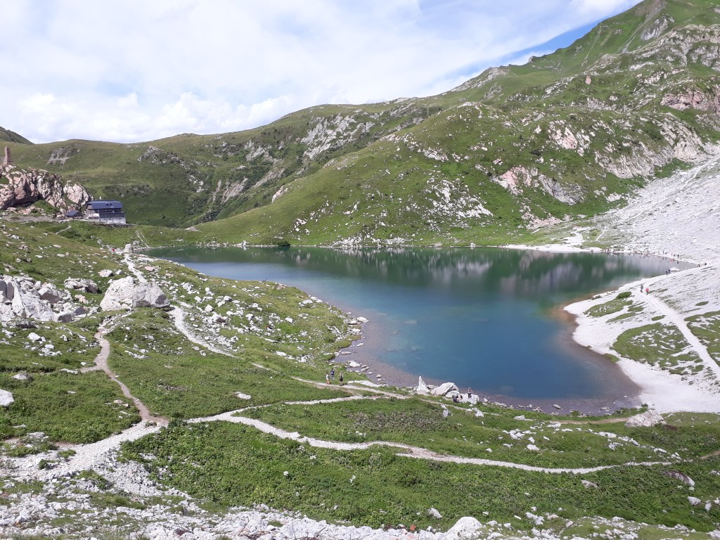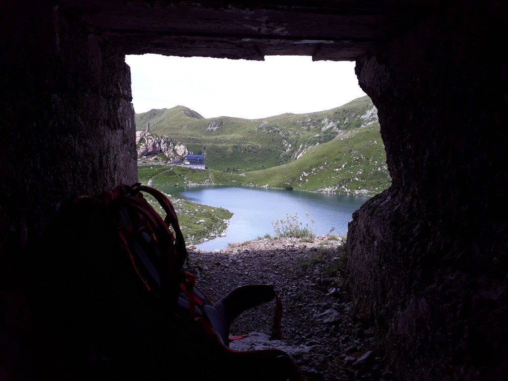 Dieser Alpensee liegt gerade noch in Österreich. An der Grenze zu Italien sind noch gut erhaltene Stellungen aus dem ersten Weltkrieg zu sehen.