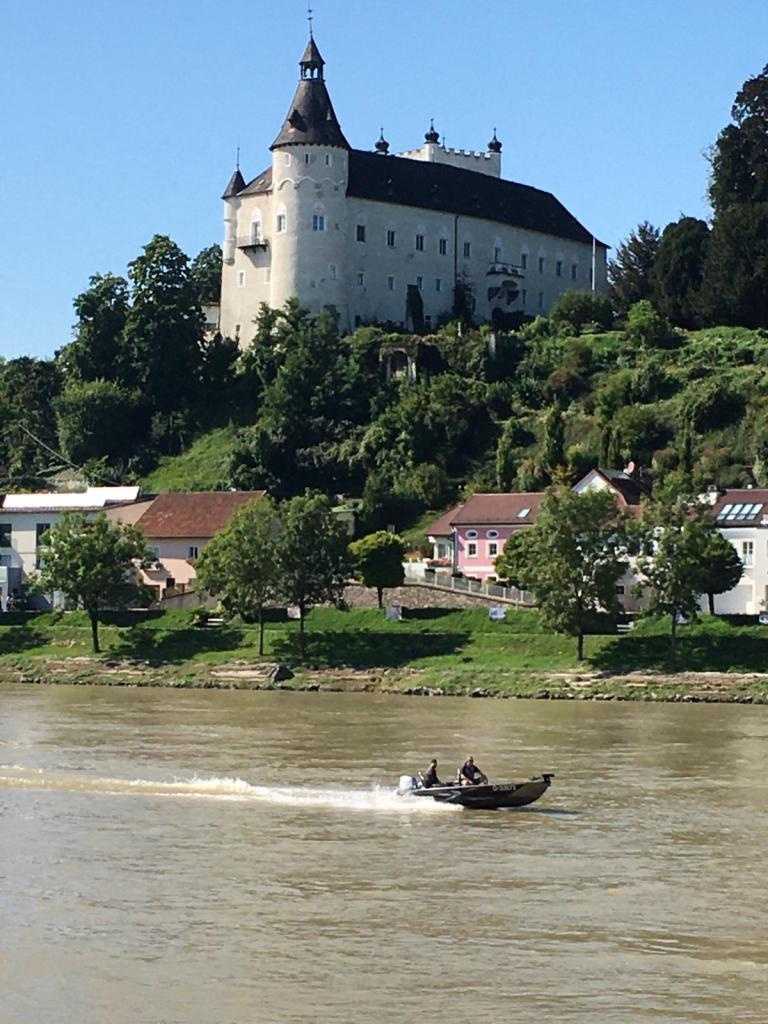 Jetzt wird es härter, denn der Anstieg auf den Koglerauerspitz hat es in sich. Beim Köglerhof werde ich schon von Ingrid auch von einer großen Gänseschar erwartet, durch die ich hindurch muss. Über das liebliche Bleicherbachtal komme ich nach Ottensheim. Es ist Markttag und an der Menschenmenge schwer vorbeizukommen. Nach den Bergpassagen fällt die Umstellung auf 10 ebene Kilometer entlang der Donau schwer. Inzwischen hat es 25 Grad und so wird ein extra Trinkstop nach dem Kraftwerk Ottensheim eingelegt.