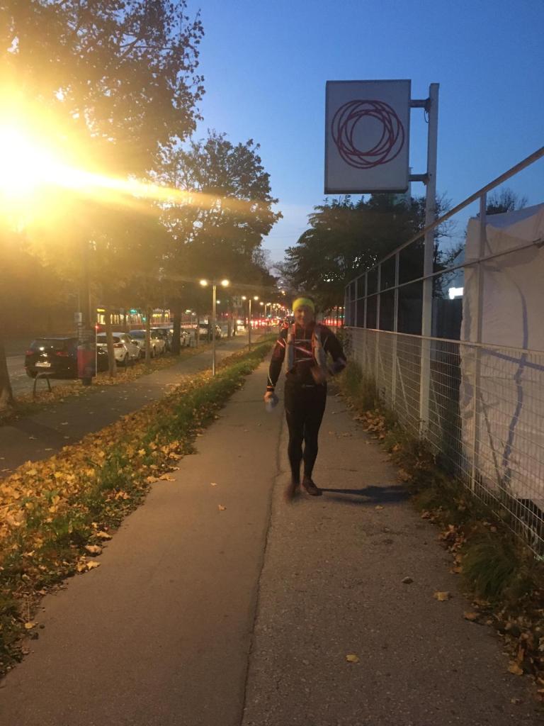 Bei der Labe am Zentralfriedhof durfte ich eine köstliche Suppe mit einem Kornspitz genießen. Haube, Handschuhe und Stirnlampe werden ausgepackt. Es ist 18:15 Uhr und der Nachtlauf beginnt. Die Halloween Feiernden sind noch nicht unterwegs, haben sie mir doch vor Jahren einen gehörigen Schreck eingejagt. Bei der Überquerung der Donau am Kraftwerk Freudenau macht sich der starke Gegenwind besonders bemerkbar. Die Laufrichtung dreht und er schiebt mir ordentlich an.