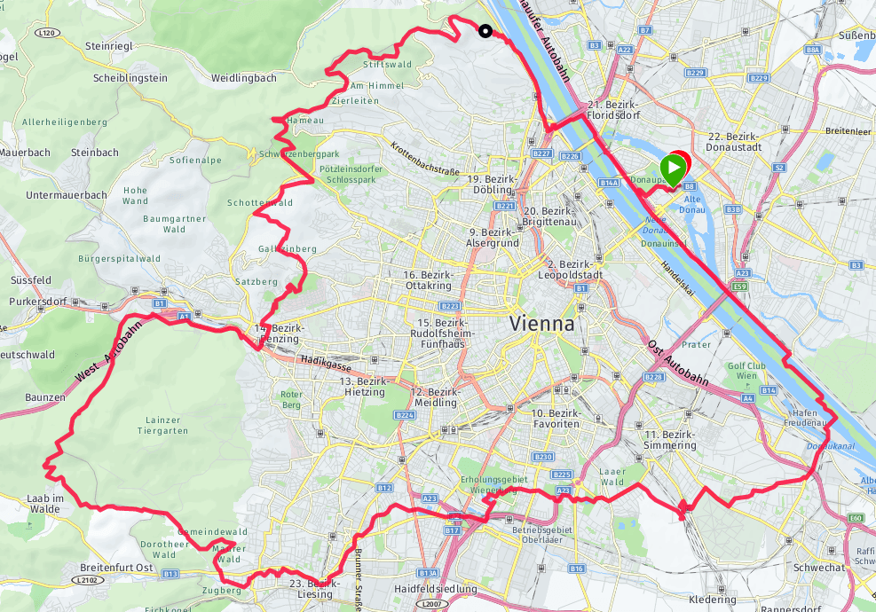Das Wiener Naherholungsgebiet Steinhof wird durchlaufen, bevor es nach Hütteldorf geht. Jetzt beginnt der zweite Teil des Wienerwaldes – nicht so aussichtsreich, dafür aber sehr fordernd. Vor allem der steile Anstieg auf den Dreihufeisenberg (518 m) hat es in sich. Nach einer langen Bergabstrecke endet der Wienerwald und die Labe beim Gütenbachtor ist in Sicht. Nach 6 Stunden und 10 Minuten sind 47 Kilometer geschafft. Überschaubare 41 Kilometer liegen noch vor mir.