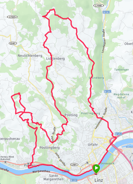 Eigentlich wollte ich weiter nach Ottensheim und dann zurück über den Prinzensteig laufen. Doch angesichts der widrigen Verhältnisse entschied ich die Strecke nach Puchenau zu nehmen. Der starke Westwind wurde immer unangenehmer und der normalerweise matschige Bergabweg war wieder eine steile Rutschpartie.