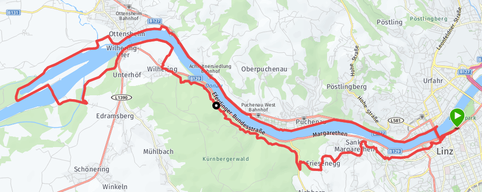 Nach dem Start am Linzer Hauptplatz geht es im gemütlichen Tempo (6:50/km) über Puchenau Richtung Ottensheim. Die Strecke ist trocken und somit steht einem wunderschönen Traillauf nichts im Wege.