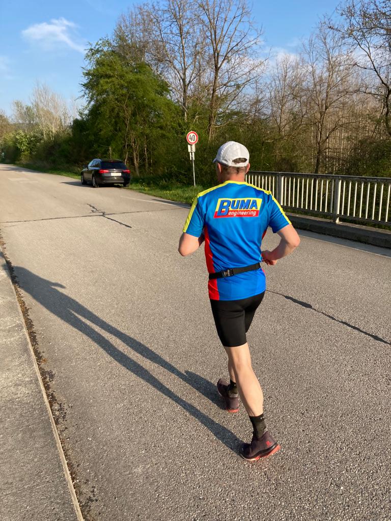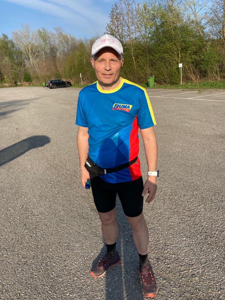 Mein Ziel war heute einfach nur gemütlich laufen. Beim Start um 6 Uhr ließ ich das Feld ziehen und begann mit einem 7-Minuten Schnitt. Nach sechs Kilometern wurde ich am Fuß des Pfenningbergs schon von Ingrid, meiner Frau, erwartet. Sie ist die gute Perle aller Extremläufe, begleitet mich und sorgt für Verpflegung und Motivation.