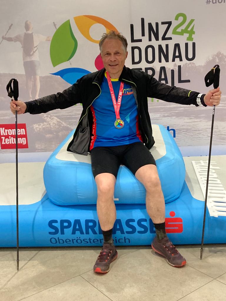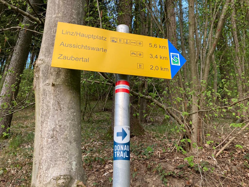 Die Bergabpassage von der Gis war trotz des Regens am Vortag schon wieder trocken und schön zu Laufen. Karoline, eine Läuferin, die schon mit mir am Sternstein Nightrun dabei war, gesellte sich zu uns. Die Konversation mit meinen beiden Begleiterinnen war sehr unterhaltsam. Am Anstieg zum Pöstlingberg holten wir Otto ein. Mit ihm war ich schon einige Male beim Traunsee Bergmarathon unterwegs. Mit einer künstlichen Hüfte hat er die 65 Kilometer Distanz geschafft!