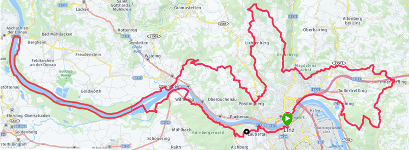 Wenn schon, dann die 102 Kilometer Variante, die noch niemand zuvor gelaufen war. Somit führte mich der Lauf am rechten Donauufer nach Aschach und auf der anderen Seite zurück. Dies war gegen die Laufrichtung und so begegnete ich einigen Läufen. Ein Spitzenduo dürfte es wohl um die 10 Stunden schaffen. Geher, die schon 18 Stunden unterwegs waren hatten noch 8 Stunden vor sich.