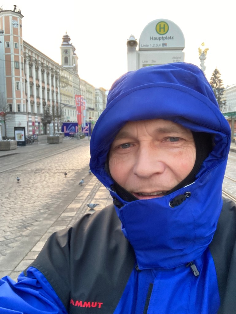 Warm eingepackt startete ich am Linzer Hauptplatz bei minus 7 Grad. Um die mitgeführten Getränke vor dem Erfrieren zu bewahren, hatte ich über der Laufbekleidung noch eine Überjacke mit Kapuze angezogen. Dazu wählte ich die hohen wasserdichten Laufschuhe mit Spikes.