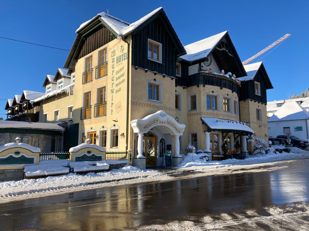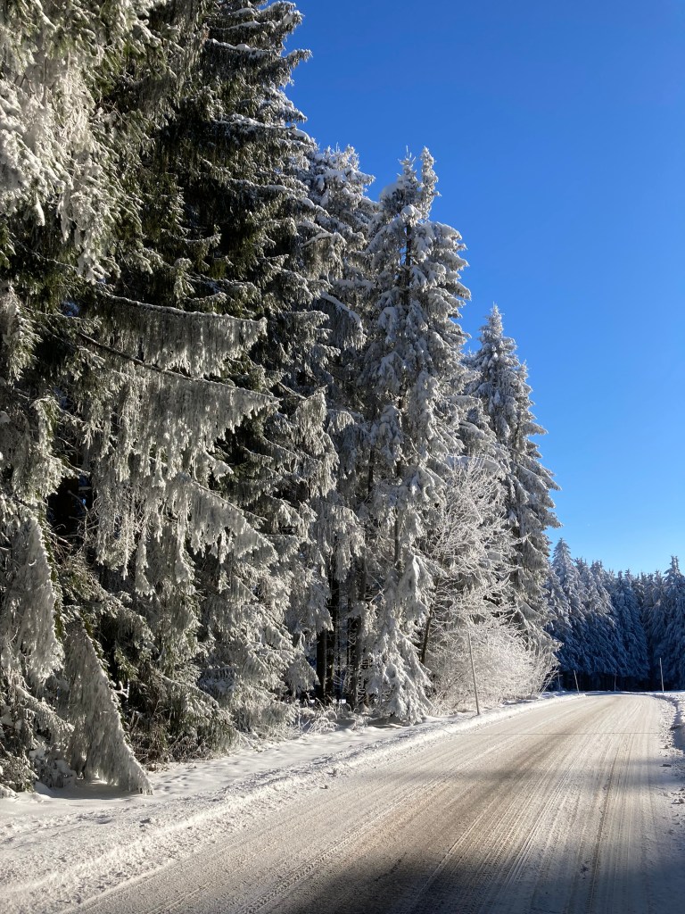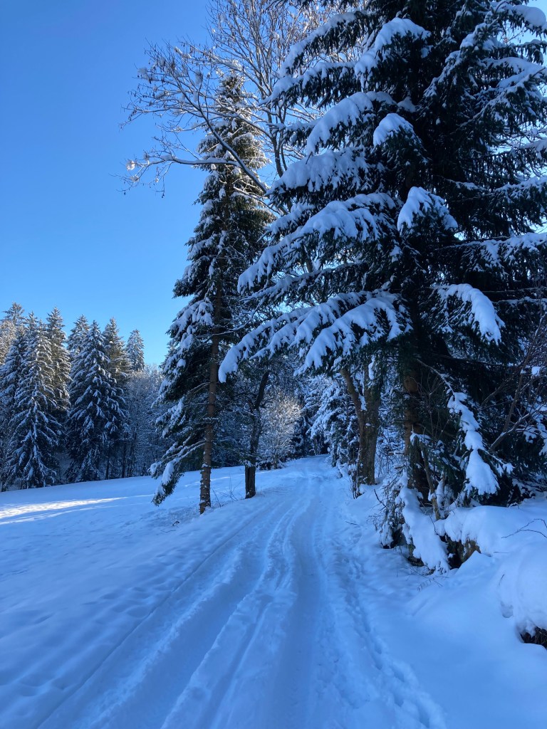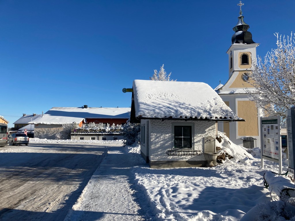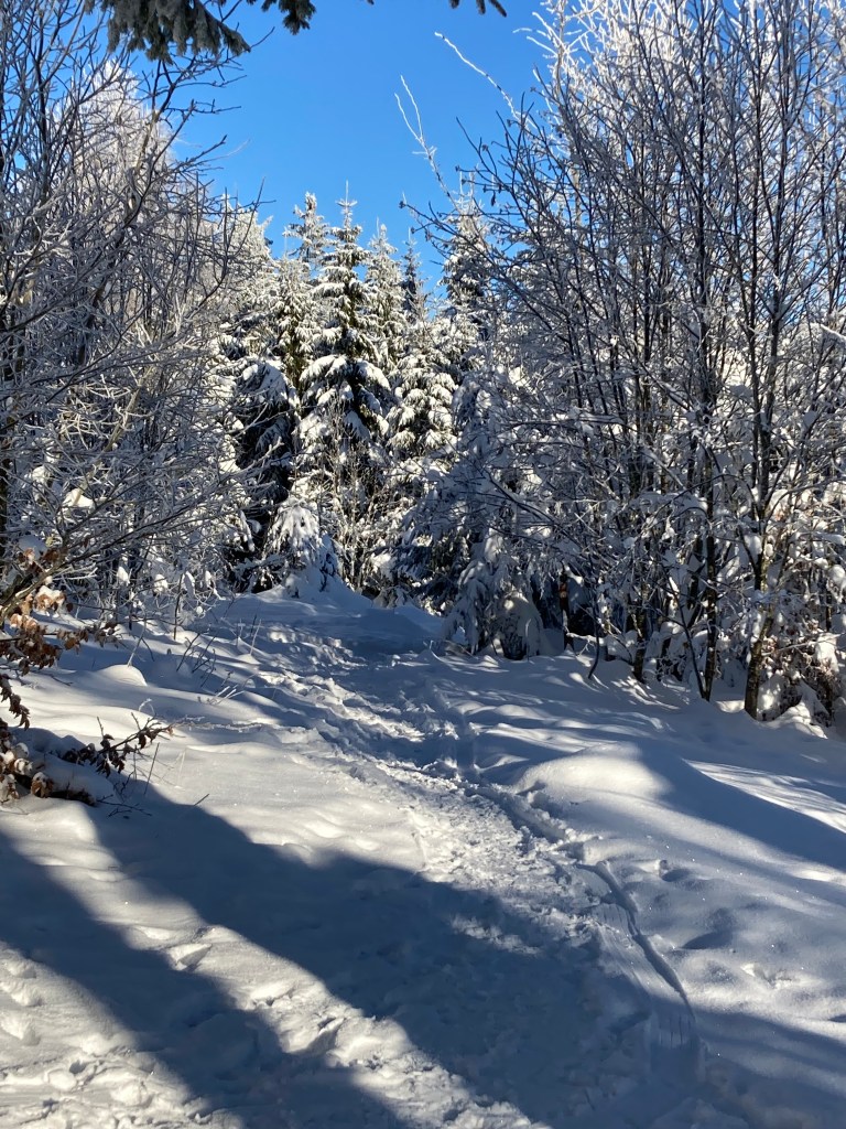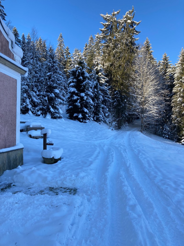 Der Weg nach Kirchschlag führte durch tief verschneite Nadelwälder. Einige Wanderer hatten einen schmalen Pfad ausgetreten, auf dem das Laufen nicht einfach war. Kurze Passagen auf Nebenstraßen waren glatt und eisig. In Kirchschlag angekommen, fühlte ich mich wie ein Außerirdischer unter den Schiläufern.