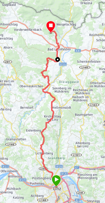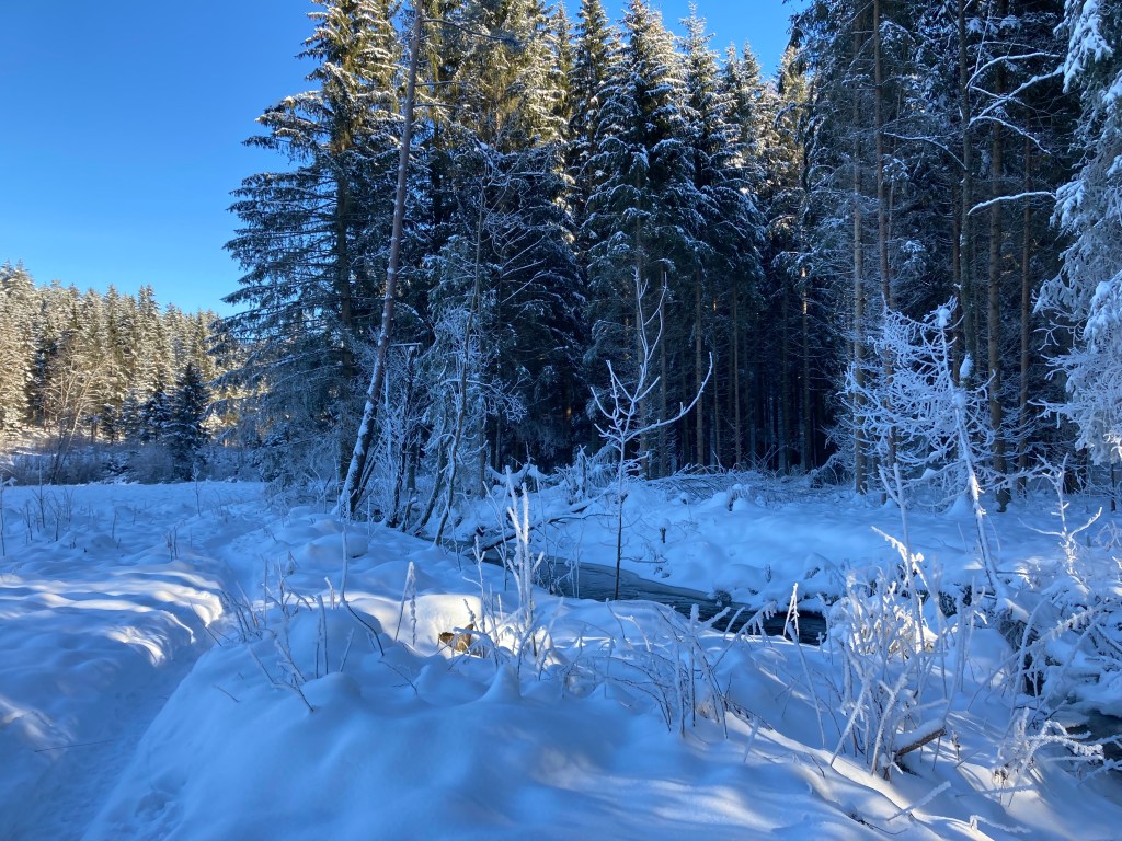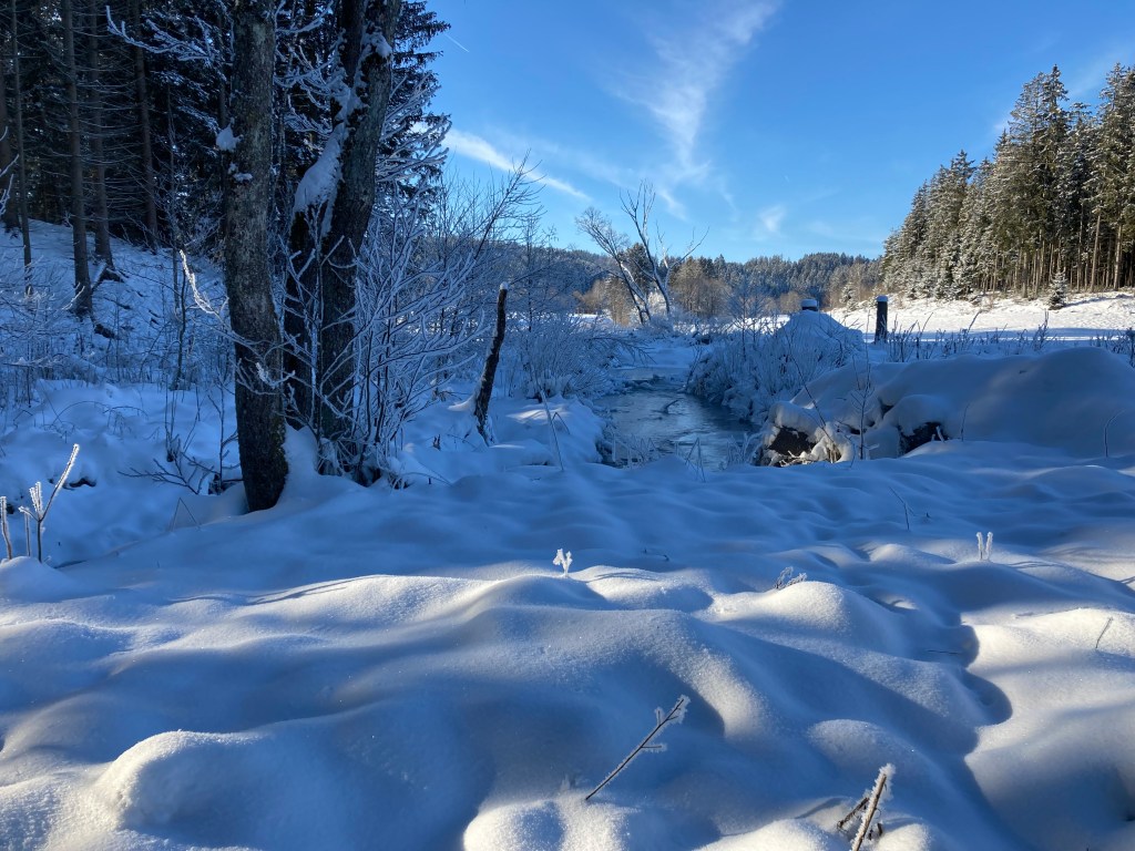 Von Kirchschlag nach Zwettl an der Rodl war der Wanderweg kaum begangen. Oft musste ich mich regelrecht durch den Schnee durchwühlen. Der Schnee hatte den Golfplatz Sterngartl in einen riesigen Langlaufplatz verwandelt. Die Langläufer dürften sich gedacht haben „was für ein Narrischer hier umherläuft“. Der romantische Bachlauf mit der Steinbrücke, getaucht in glitzerndes Weiß, ist einer der schönsten Anblicke auf der Strecke.