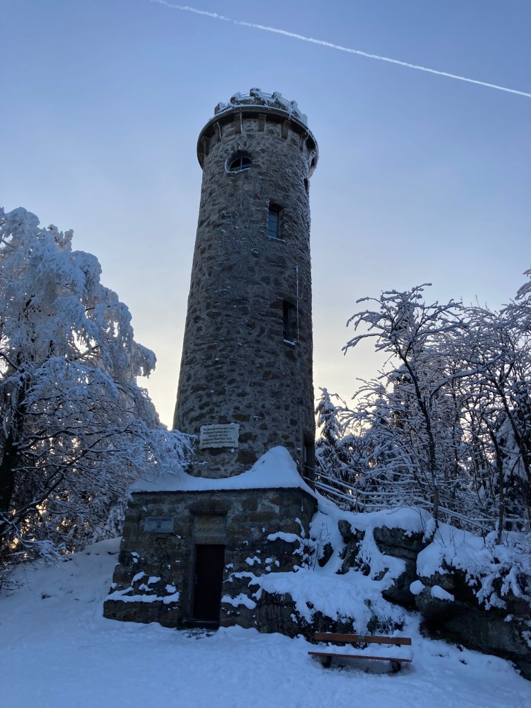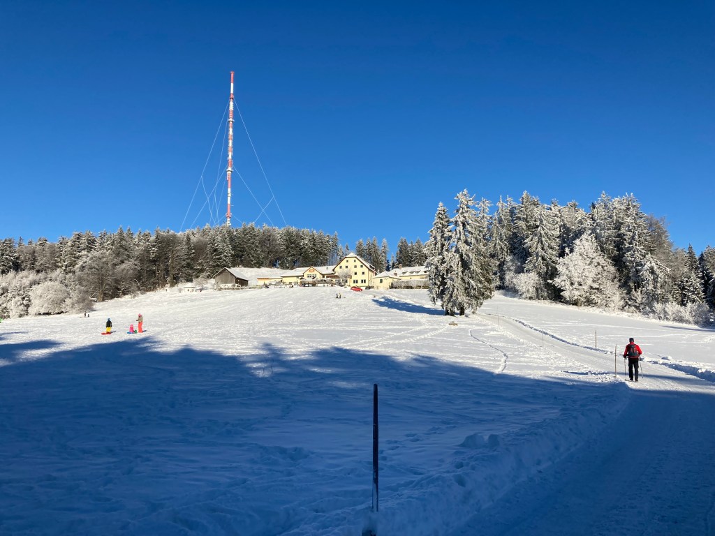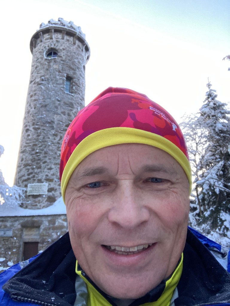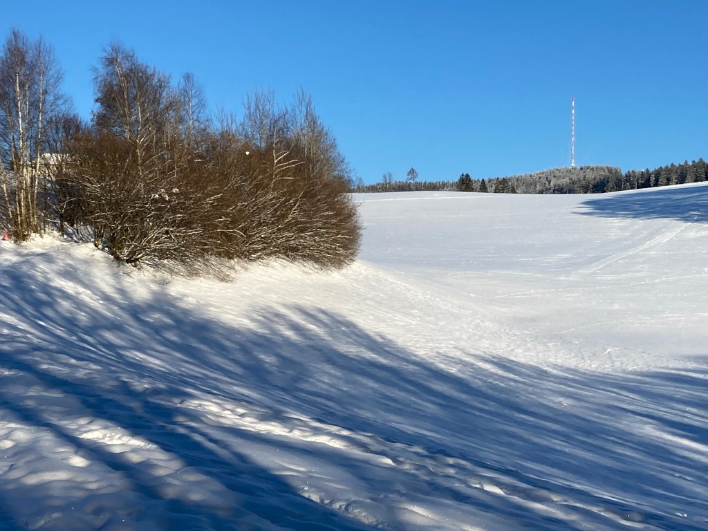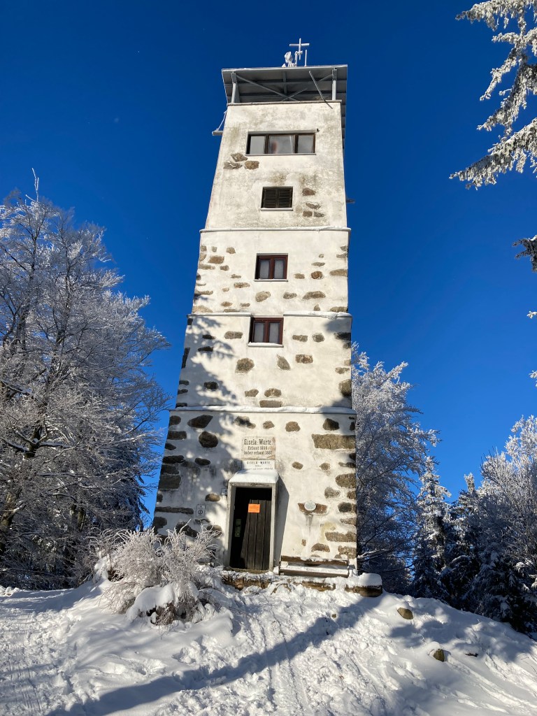 Im winterlichen Sternwald Richtung Bad Leonfelden war die Orientierung trotz guter Ortskenntnisse wahrlich nicht einfach. Einer Traktorspur folgend führte mich der Weg aus dem Wald hinaus und bescherte einen Umweg von einem guten Kilometer. Dafür war das Ziel der Sternstein schon sichtbar. Dieser Anstieg hatte es in sich! Noch einmal volle Kraftanstrengung für einige steile Passagen im Tiefschnee und die Warte wurde erreicht.