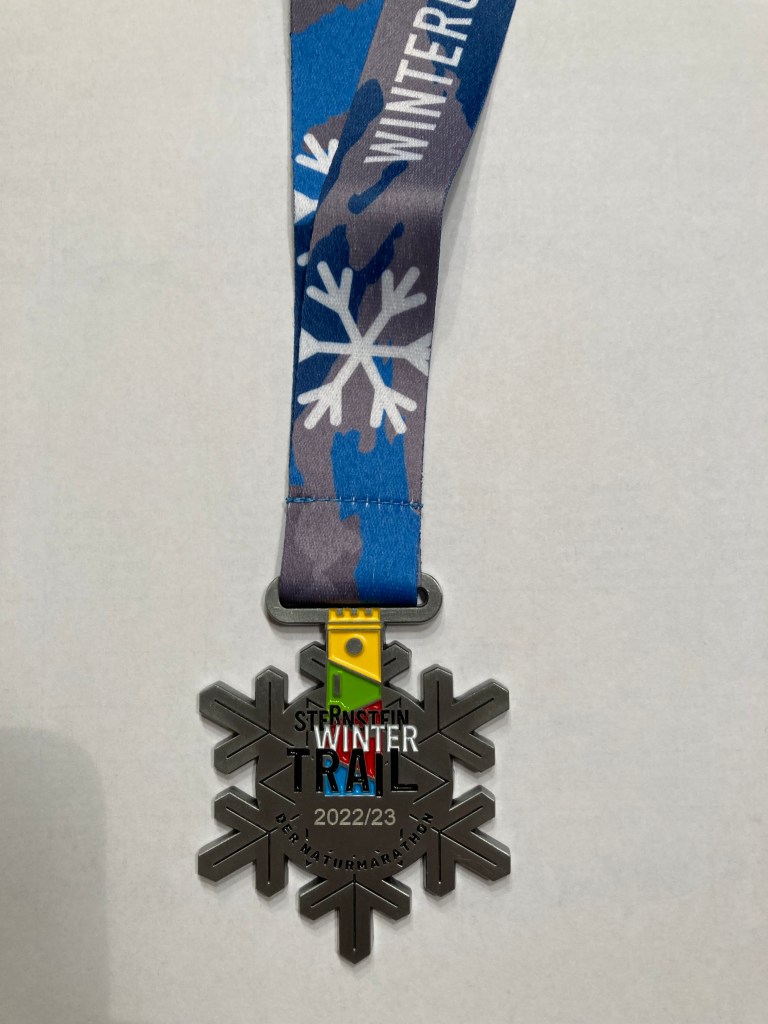 Das Ziel ist der Gasthof Waldschenke, wo ich mir als Erster die begehrte Sternstein Wintertrail-Medaille abholen durfte. Ich war glücklich, denn ich hatte es nach 44 Kilometer mit 1.700 Höhenmeter in 7 ½ Stunden geschafft!