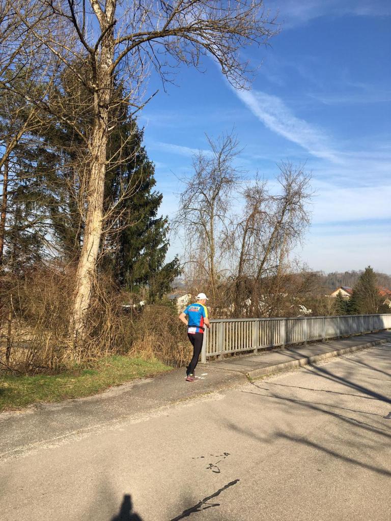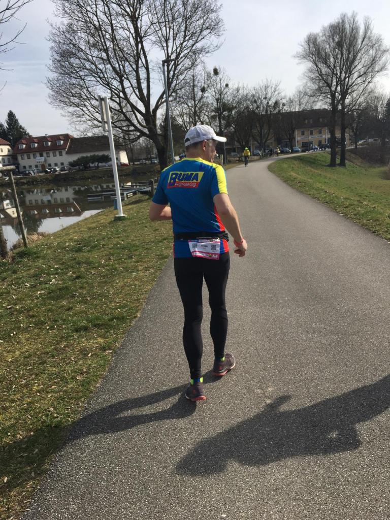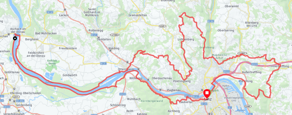 Über das liebliche Bleicherbachtal gelange ich nach Ottensheim. 54 Kilometer sind geschafft. Doch jetzt beginnt für mich der harte Teil der Strecke. 35 ebene Kilometer entlang der Donau sind eine gewaltige mentale Herausforderung. Viele Geher, die 6 Stunden vorher gestartet sind bringen beim Überholen positiven Schwung in die Monotonie. Endlich ist die Brücke in Aschach in Sicht! Jetzt geht es zurück nach Linz. Endlose gerade Kilometer sind dennoch zu bewältigen.