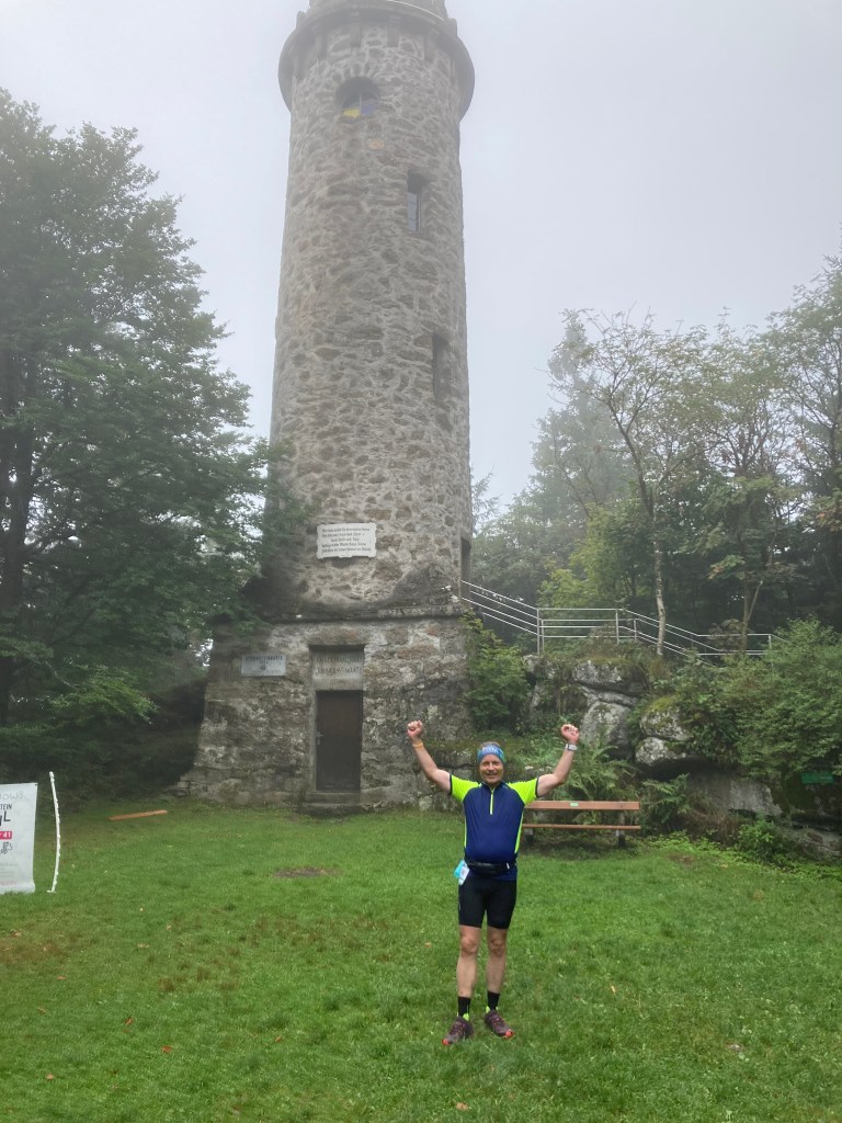 Die Ankunft in Bad Leonfelden ist nach 35 Kilometern in 4:20 Stunden. Ich freue mich auf die Labestation mit den guten, selbst hergestellten Müsliriegeln. Ein wahrer Genuss! Gut gelabt nehme ich die 6,5 Kilometer und 450 Höhenmeter bis zum Sternsteingipfel in Angriff. Die Kräfte lassen nach und die Härte beginnt. Nach 50 Minuten ist der Gipfel mit der Warte (1.125 m) erreicht. Überglücklich laufe ich zum Gasthof Waldschenke, wo sich das Ziel befindet. Jeder Teilnehmer wird hier mit lautem Kuhglockengeläute empfangen. Eine gute Suppe und ein Radler runden das schöne Erlebnis ab.