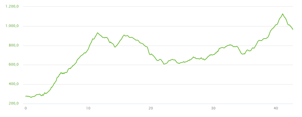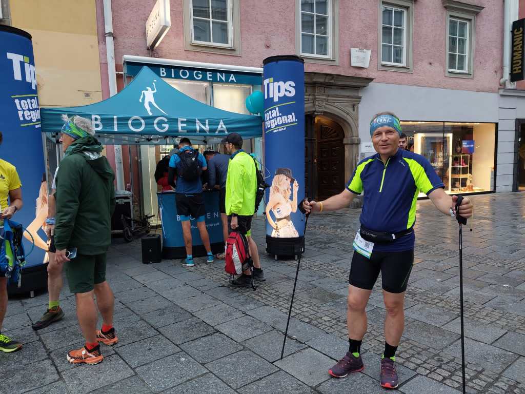 Mit wenigen Laufkilometern am Buckel stehe ich um 7:30 im Start und hoffe auf eine Zielzeit unter 6:30 Stunden. Nach dem Regen in der Nacht ist es bewölkt bei Temperaturen um die 10 Grad und teilweise leicht darüber. 43 Kilometer und 1.650 Höhenmeter bergauf und 900 bergab liegen vor mir.