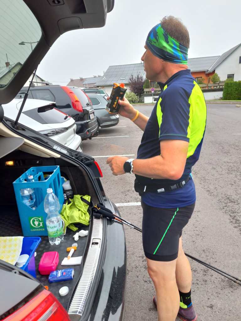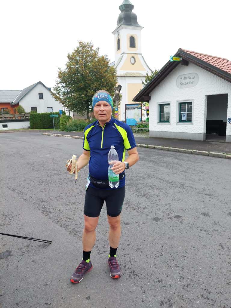 Nach 1:30 Stunden, 10,5 Kilometer und 700 Höhenmeter ist die Gis erreicht. Meine Frau Ingrid wartet geduldig auf mich und versorgt mich mit Getränken und von ihr selbstgemachten Riegeln. Liebe Ingrid, vielen Dank dafür! Nach Kirchschlag geht es zuerst bergab und ich lasse meine Füße so richtig laufen. Kirchschlag (15,5 Kilometer) wird nach gut 2 Stunden erreicht.