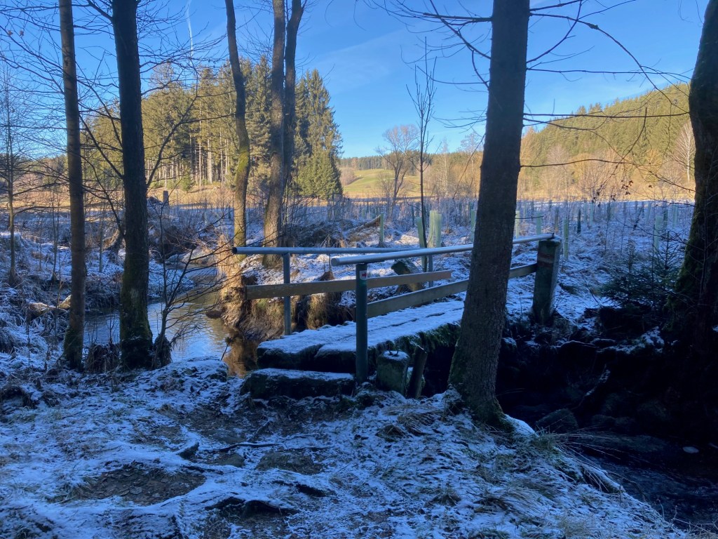 Entlang des beschaulichen Distelbaches führte der Weg zum Golfplatz Sterngartl. Ein malerischer Platz – auch im Winter! Ein paar Minuten später erreichte ich die idyllische Steinbrücke. Jedoch wurde die Freude jäh getrübt, denn der Weiterweg über die Wiese stand unter Wasser. Auch auf der Ausweichrute wurden die Füße ordentlich nass. Zudem war ein Bach nur über ein vereistetes schmales Brett zu überqueren. Eine heikle Angelegenheit!