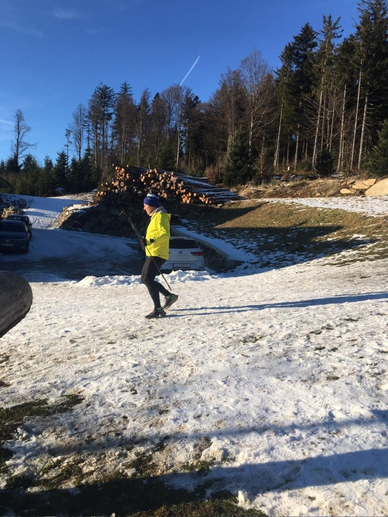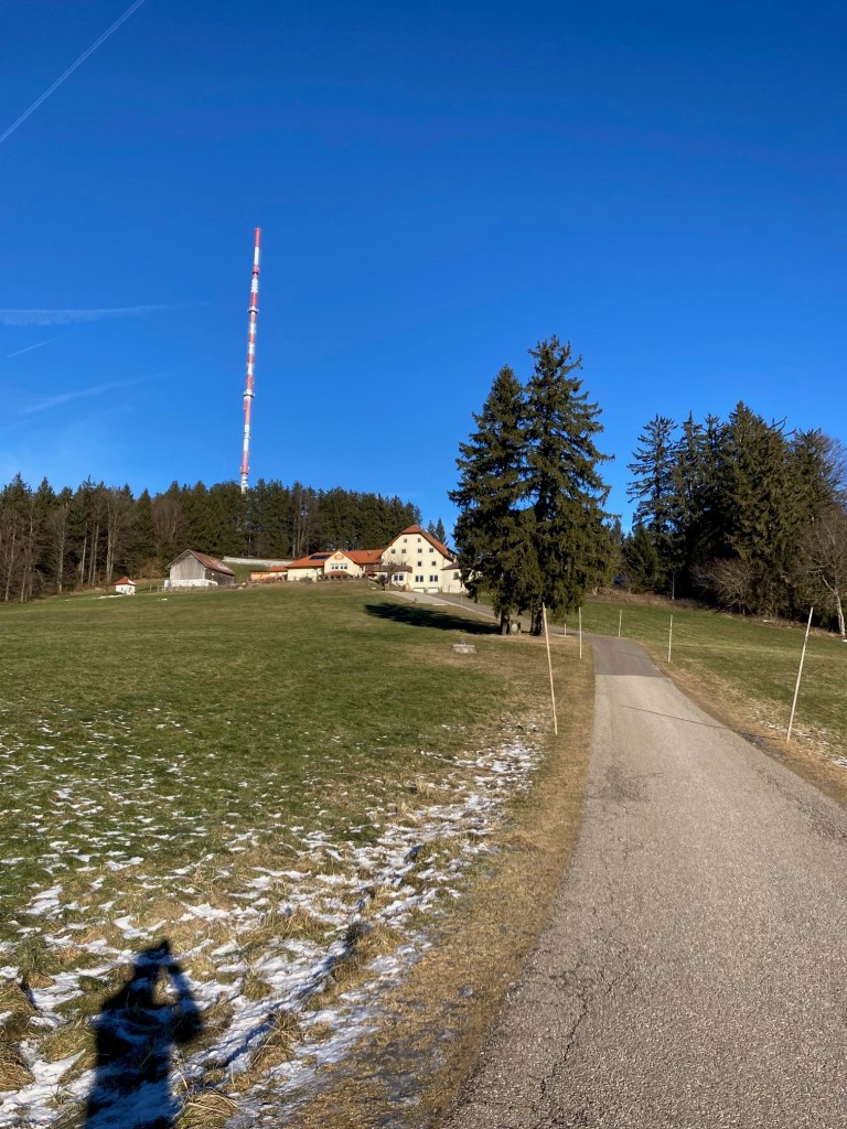 Auf halben Weg zur Gis holte ich einen Traktor ein, der fahrend im Hohlweg zwei Bäume im Schlepptau hatte. Überholen war unmöglich und so trottete ich hinterher. Auf der Gis zeigte das Thermometer schon leichte Plusgrade. Ganz oben bei der Warte lag noch Schnee und machte das Bergablaufen mehr als interessant. Apere Stellen wechselten mit eisigen und schneebedeckten Abschnitten.