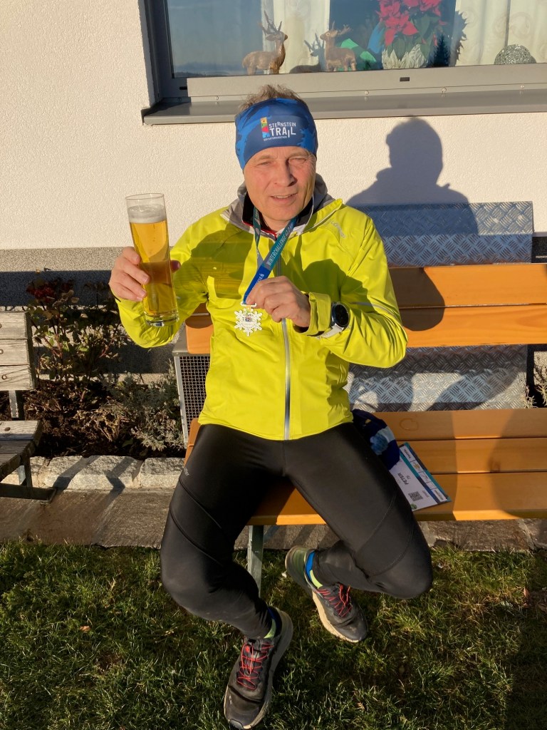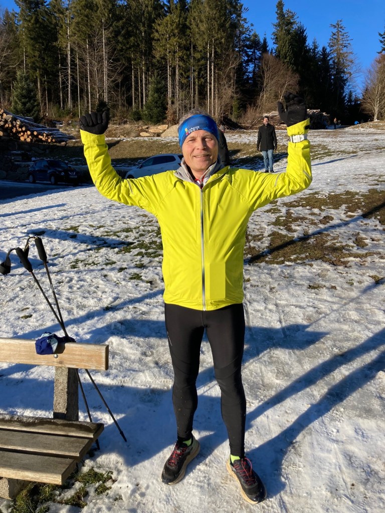 Das Beste – der Aufstieg auf den Sternstein – folgte zum Schluss. Die zuerst aperen Wege wurden immer eisiger. Der Anstieg zum Gasthaus Waldschenke war schneebeckt und rutschig. Doch die letzten 100 Höhenmeter zum Gipfel hatten es in sich! Steinige vereiste Wege forderten die letzte Kraft. Nach 41,5 Kilometer in 5:52 Stunden erreichte ich die Warte am Gipfel auf 1.125 Meter Seehöhe. Hurra ich hatte es wieder einmal geschafft! Voller Freude sah ich dem bunten Treiben der Schifahrer zu, die auf der anderen Seite ins Tal fuhren. Noch ein Kilometer und das Ziel beim Gasthof Waldschenke war in Sicht. Bei 8 Grad auf einem sonnigen Bankerl feierten Ingrid und ich den gelungenen Tag.