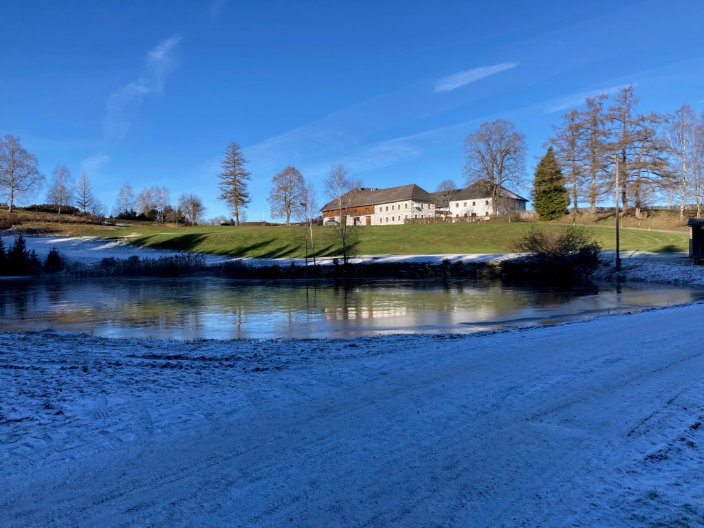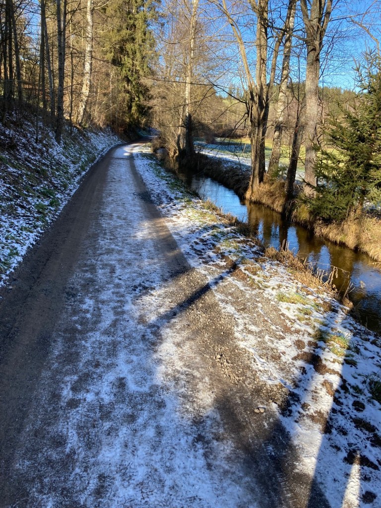 Kirchlag war bald erreicht. In Kindertagen sind wir hier Schi gefahren, doch jetzt ist alles aper. Richtung Bad Leonfelden folgte ein 20 Kilometer langer Abschnitt, der gut zu laufen ist. Eine dünne Schneedecke auf den Waldwegen dämpfte die angenehme Laufbewegung. Die nasse Wiese vor Zwettl an der Rodl war gottseidank gefroren. Füher als erwartet wurde Zwettl nach 3:20 Stunden erreicht. 25 Kilometer waren geschafft – 18 lagen noch vor mir.