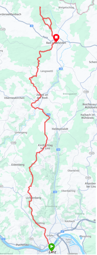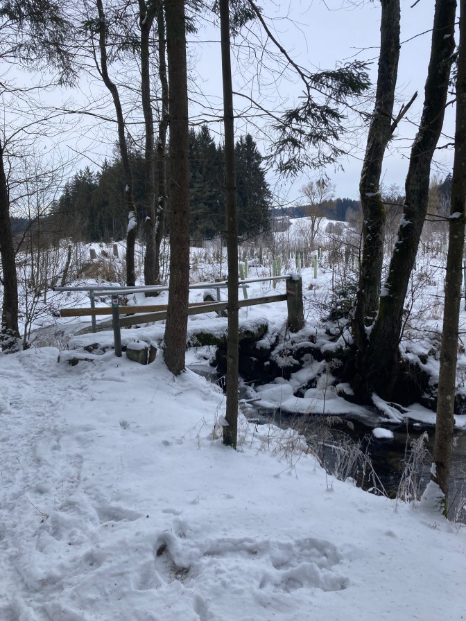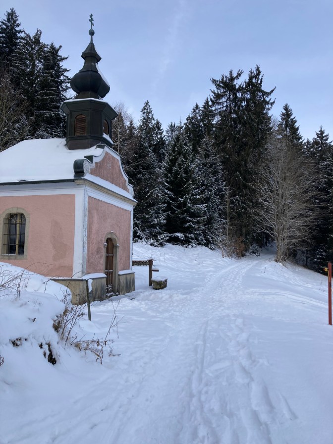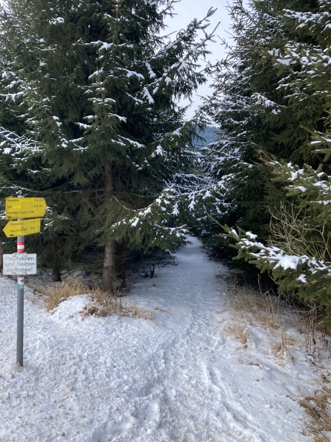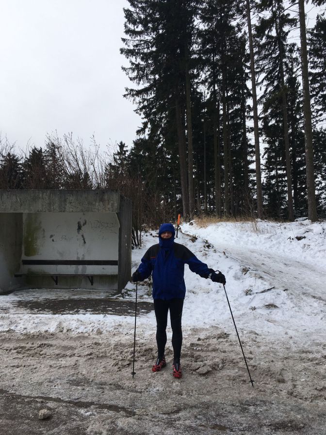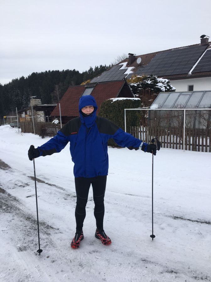 Um 8 Uhr wurde gestartet, um das Ziel – heuer in Bad Leonfelden- bis 16 Uhr zu erreichen. Die letzten Tage waren sehr frostig. Dies zeigte sich gleich am Anstieg zur Gis, denn der Weg neben dem Diesenleitenbach war komplett vereist. Die Winterlaufschuhe mit Spikes waren notwendig um hier durchzukommen. Dafür war die Schneemenge noch überschaubar.